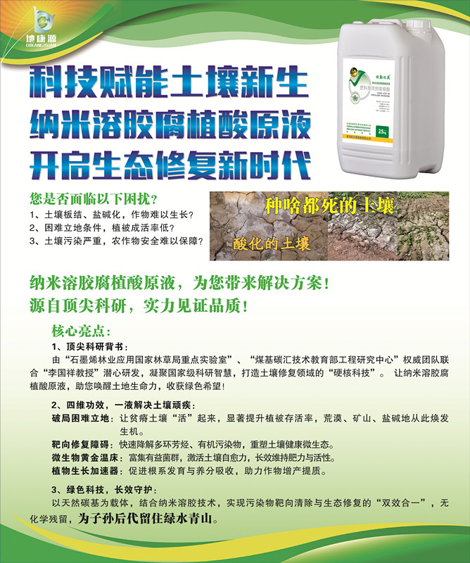 ? 由“石墨烯林業應用國家林草局重點實驗室”、“煤基碳匯技術教育部工程研究中心”權威團隊聯合“李國祥教授”潛心研發,凝聚國家級科研智慧,打造土壤修復領域的“硬核科技”。讓納米溶膠腐植酸原液,助您喚醒土地生命力,收獲綠色希望!